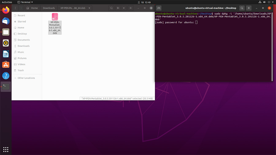 6. Type in "sudo dpkg -i" then drag the XP-PEN Linux driver into it.
