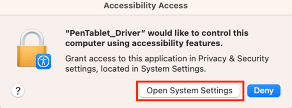 9. Try to use the pen to control the cursor and touch the tablet, when this window shows up, please click on “Open System Settings. (If the window below doesn’t show up, please restart the computer and try it again.)