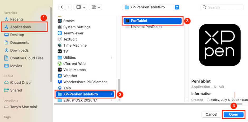 7. Go to "Applications" and find the "XP-PenPenTabletPro" folder. Double-click Pentablet to open it.