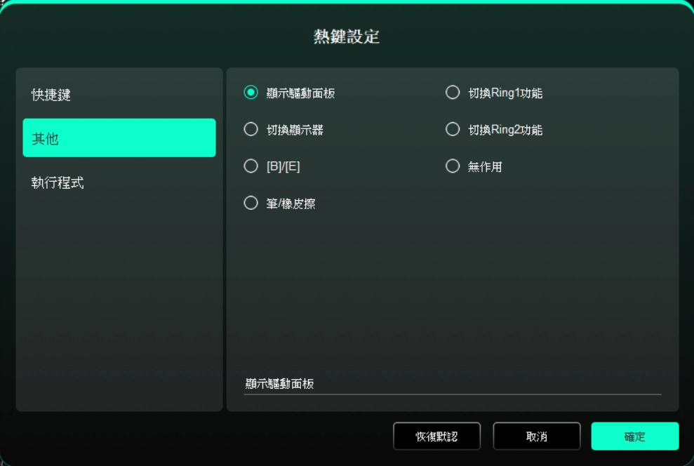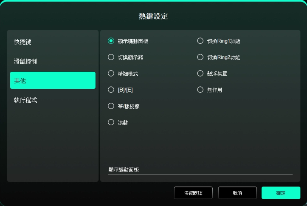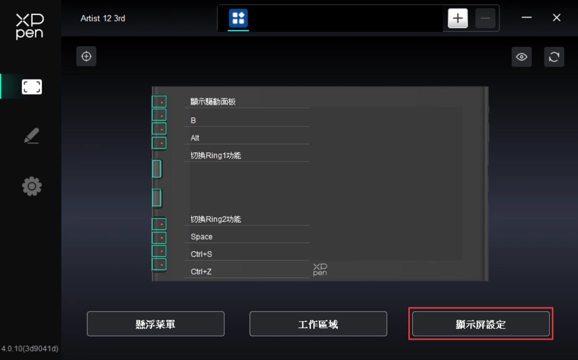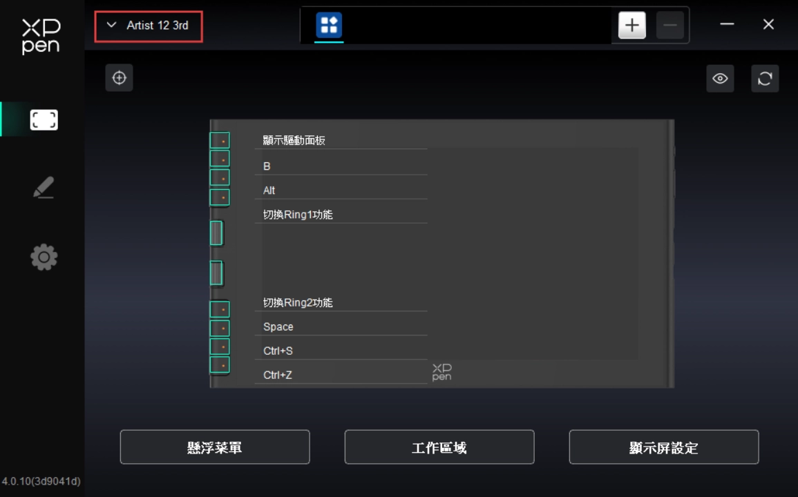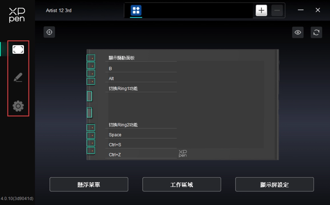 透過點選驅動程式左側圖示,即可切換驅動程式功能,協助您設定手繪螢幕的相關設定,包括: