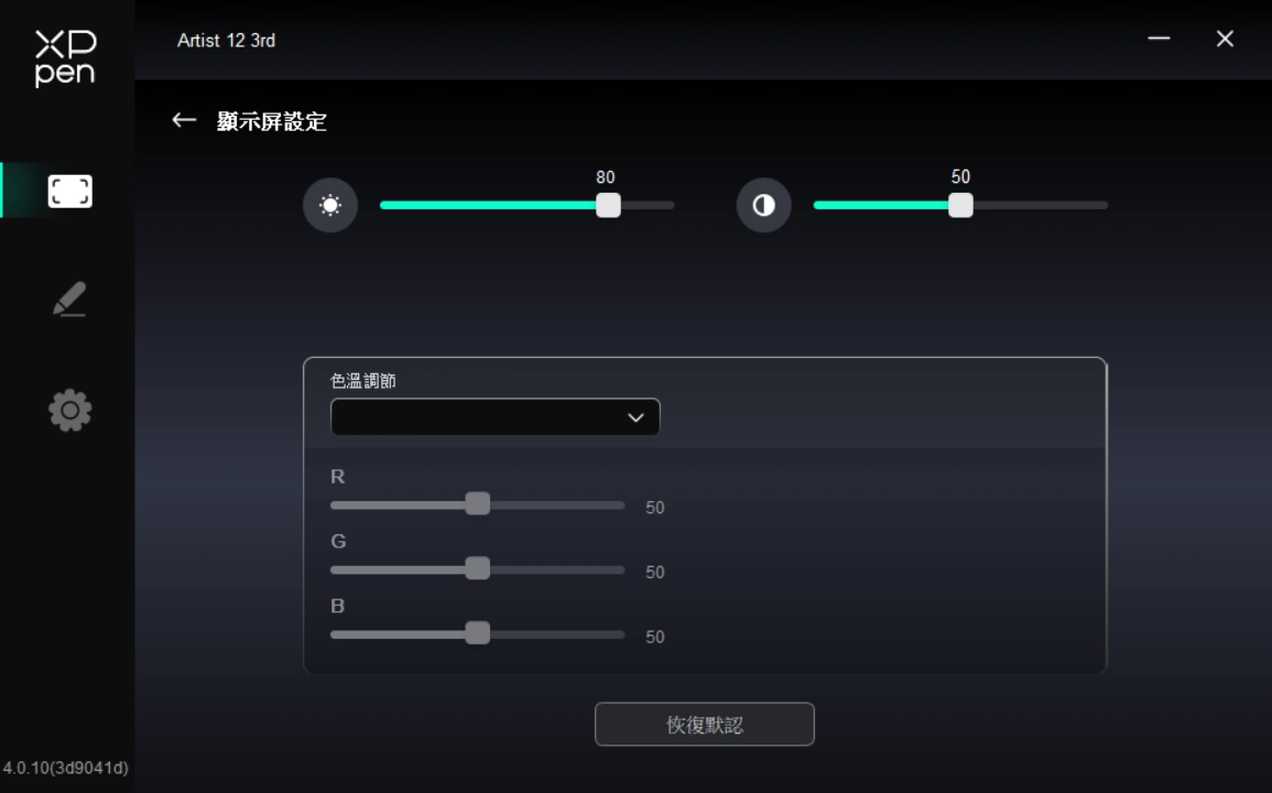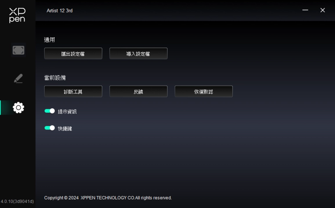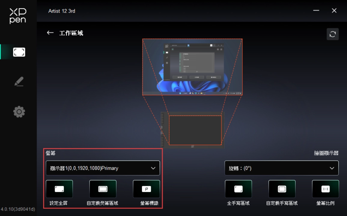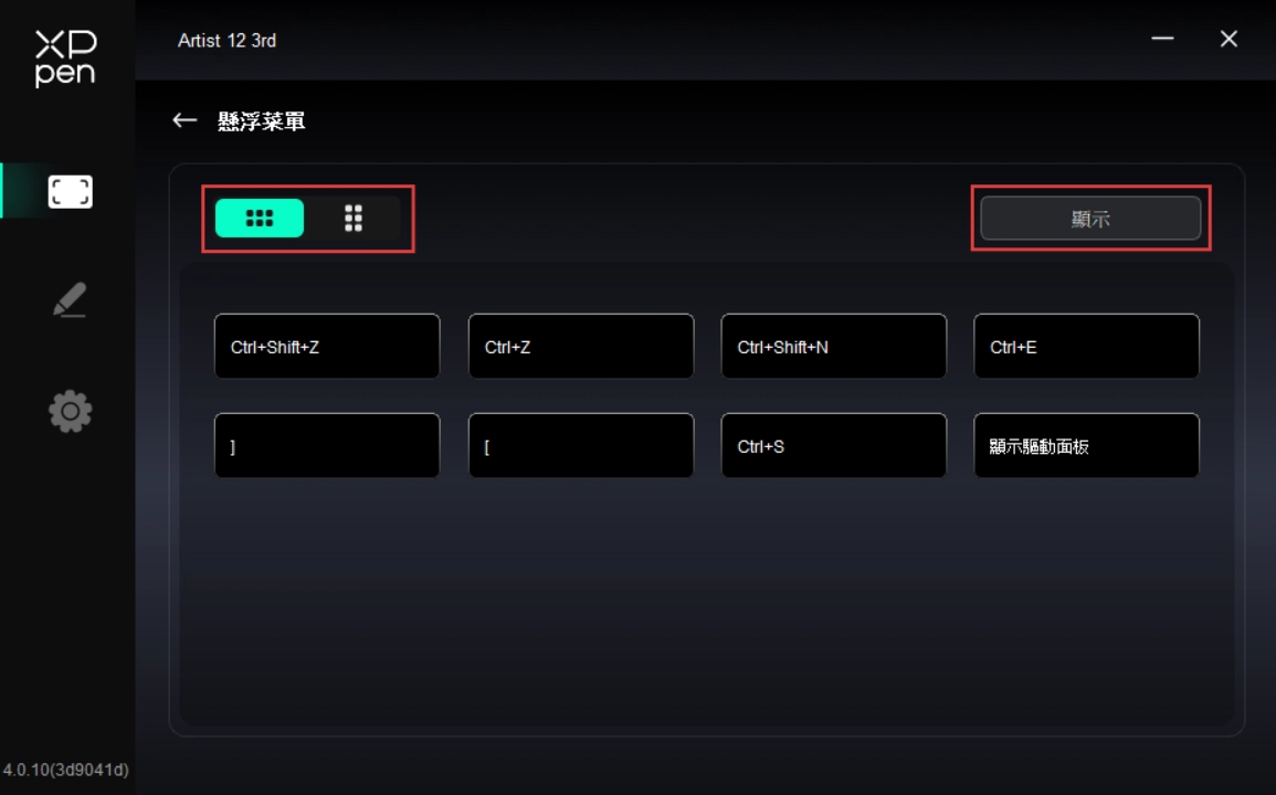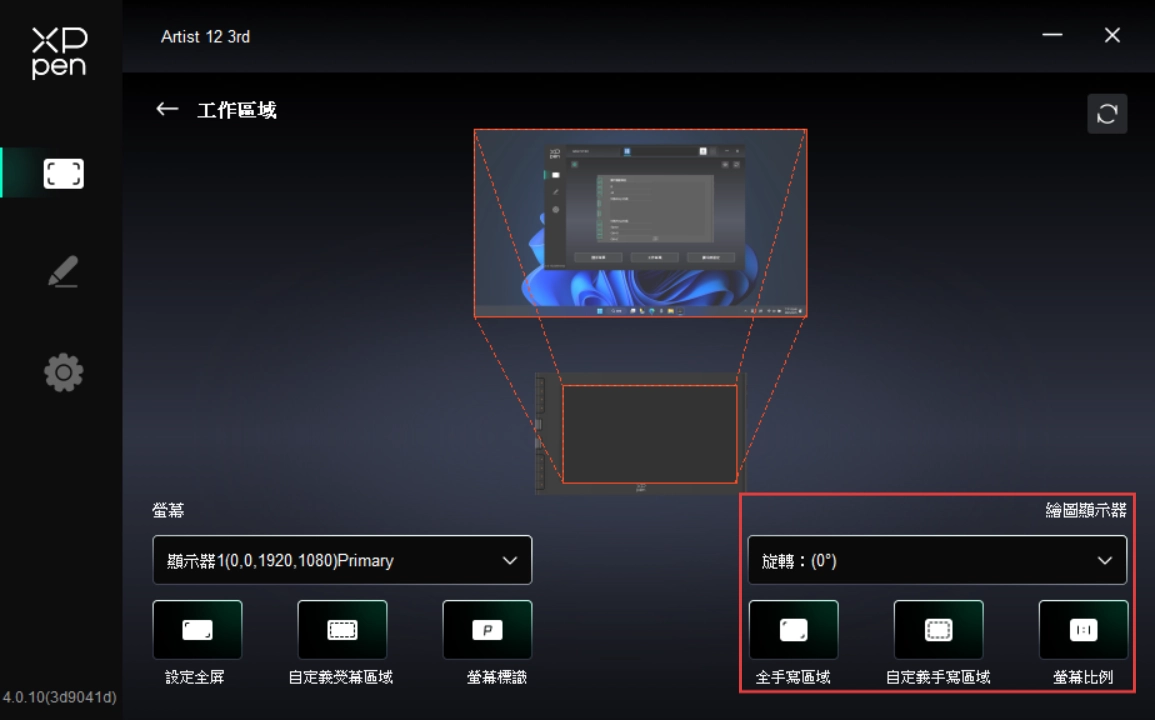 透過點選驅動程式左側圖示,即可切換驅動程式功能,協助您設定手繪螢幕的相關設定,包括: