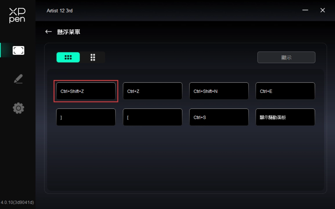懸浮選單可在手繪螢幕或電腦螢幕上顯示懸浮快捷鍵。您可於懸浮選單上設定常用操作,然後使用手繪筆或滑鼠點選此按鈕並執行所設定的操作。您可以透過點選驅動程式首頁的「懸浮選單」按鈕,進入懸浮選單頁面自訂顯示方式及功能。