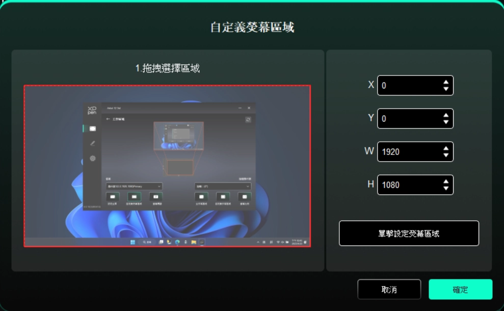 點選設定手寫區域:點選後,用手繪筆在裝置工作區域上點選要選取的「左上角」位置與「右下角」位置。
