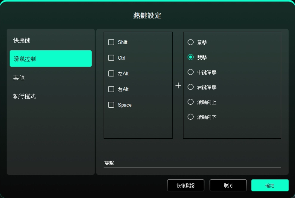 設定滑鼠與鍵盤組合鍵,如選擇「Shift」和「點選」後,可在支援此組合鍵的軟體中執行此快捷操作。