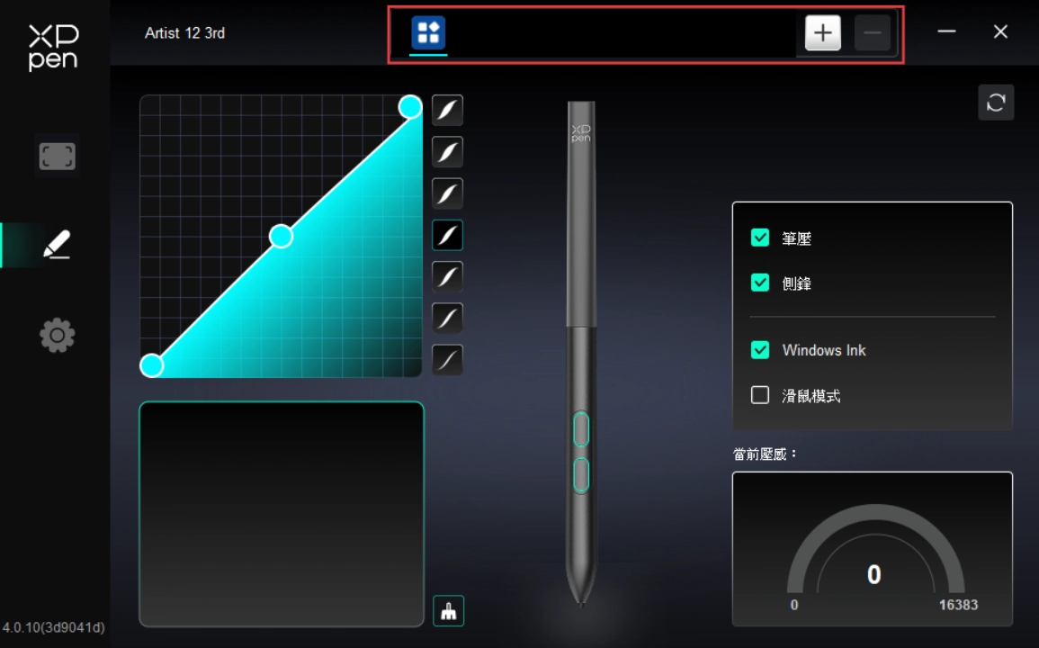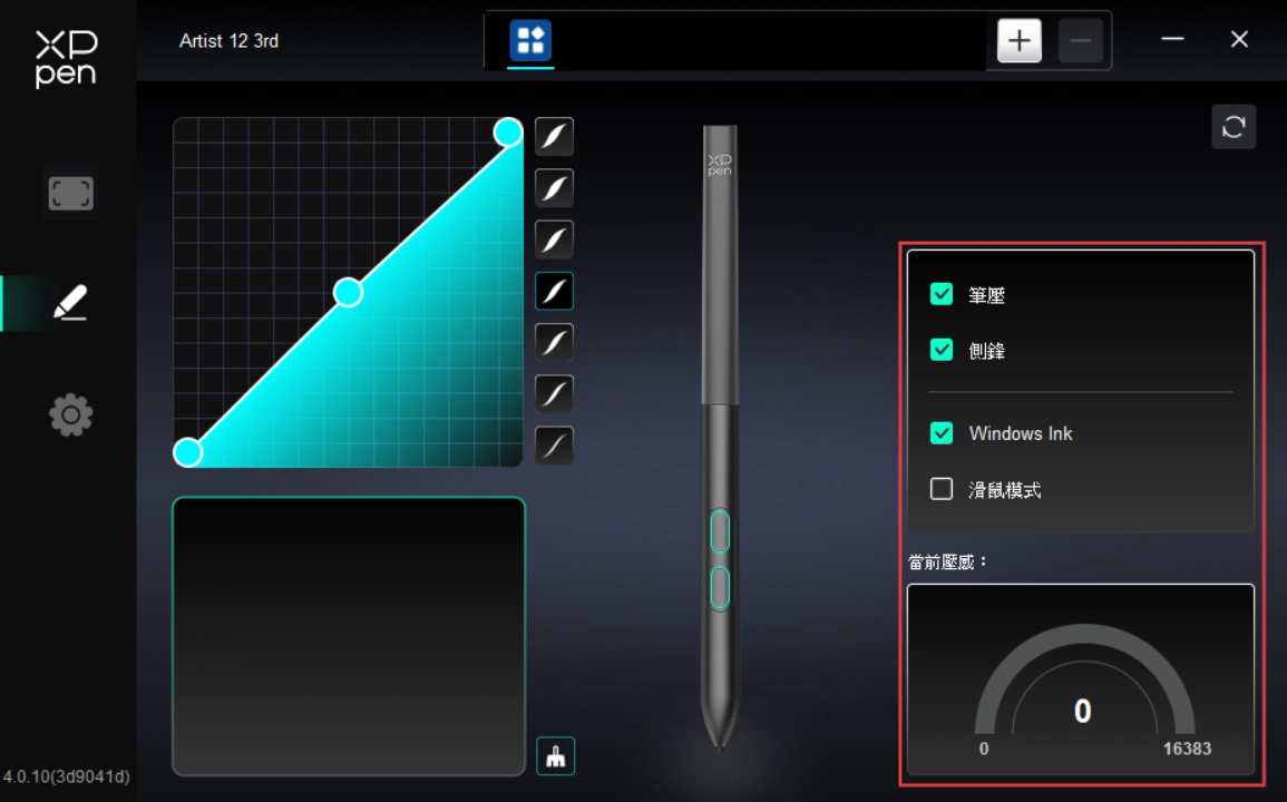 6) 如果驅動程式中的筆壓正常(Windows:確保驅動程式的筆設定中已啟用 Windows Ink),請執行繪圖軟體並再次測試。