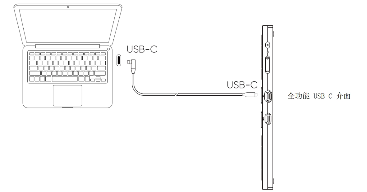 2. 將 USB-C to USB-C 傳輸線的一端插入手繪螢幕端標示為的全功能 USB-C 介面;