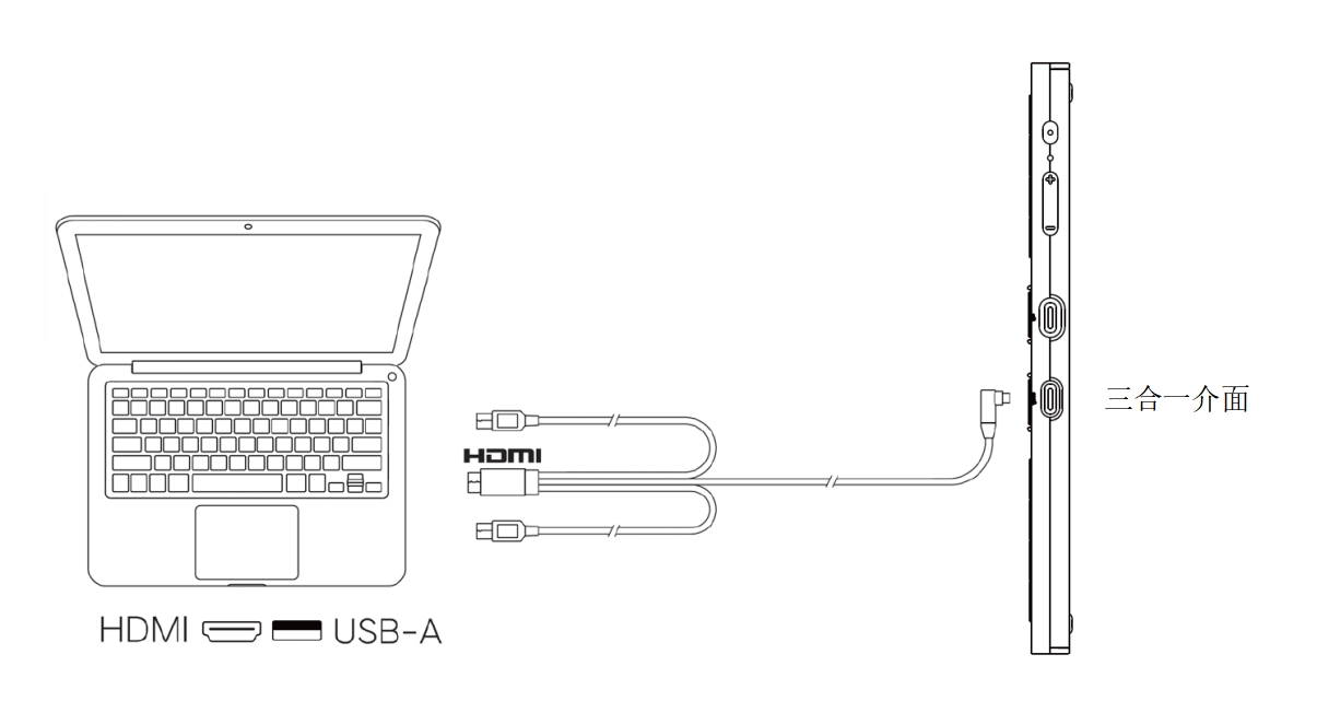 4. 若手機供電不足,請使用三合一線將電源轉接器連接至手繪螢幕端標示為的三合一介面。