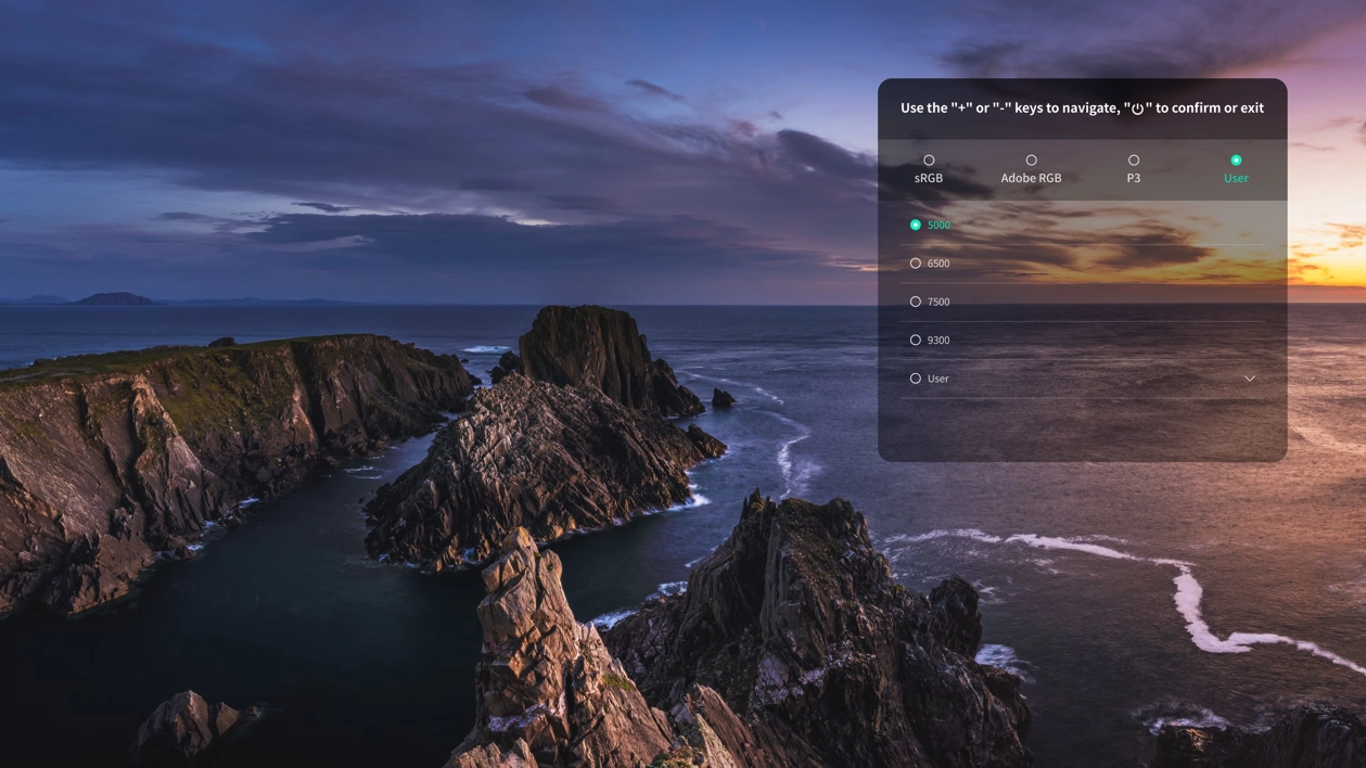 自訂色彩:選擇 User 子選項,按下電源鍵進入子選項,可透過「+」「-」鍵調整 R(紅)、G(綠)、B(藍)滑桿,精確控制色彩輸出,按電源鍵確認設定,按「+」鍵向上退出子選項