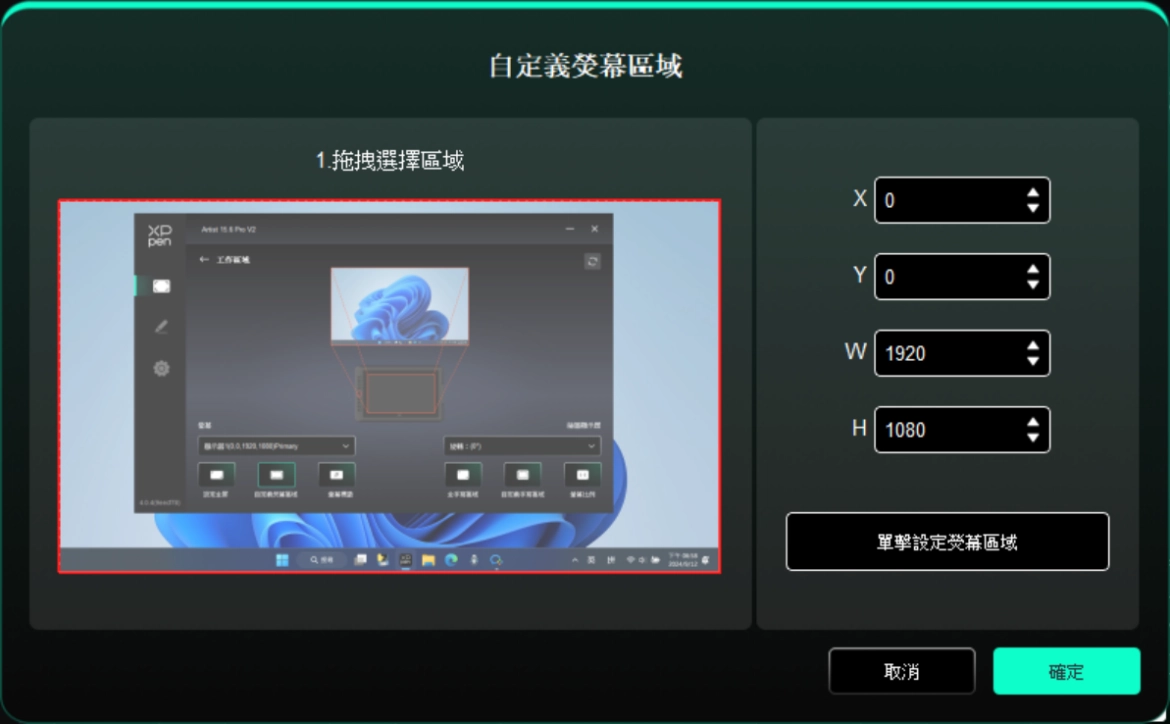 單擊設定熒幕區域:單擊後,用數位筆在設備工作區域上點擊要選取的“左上角”位置和“右下角”位置。
