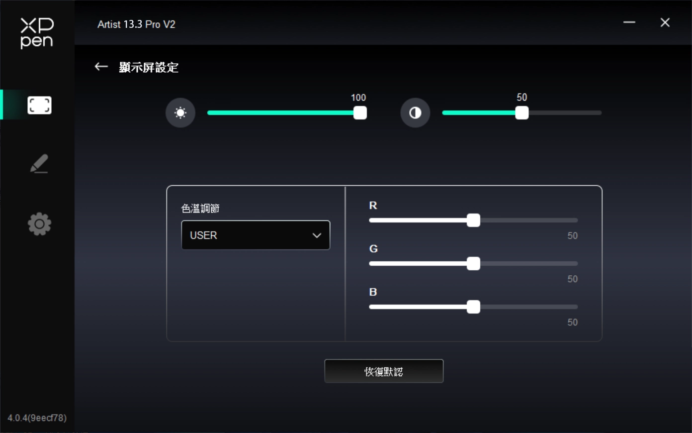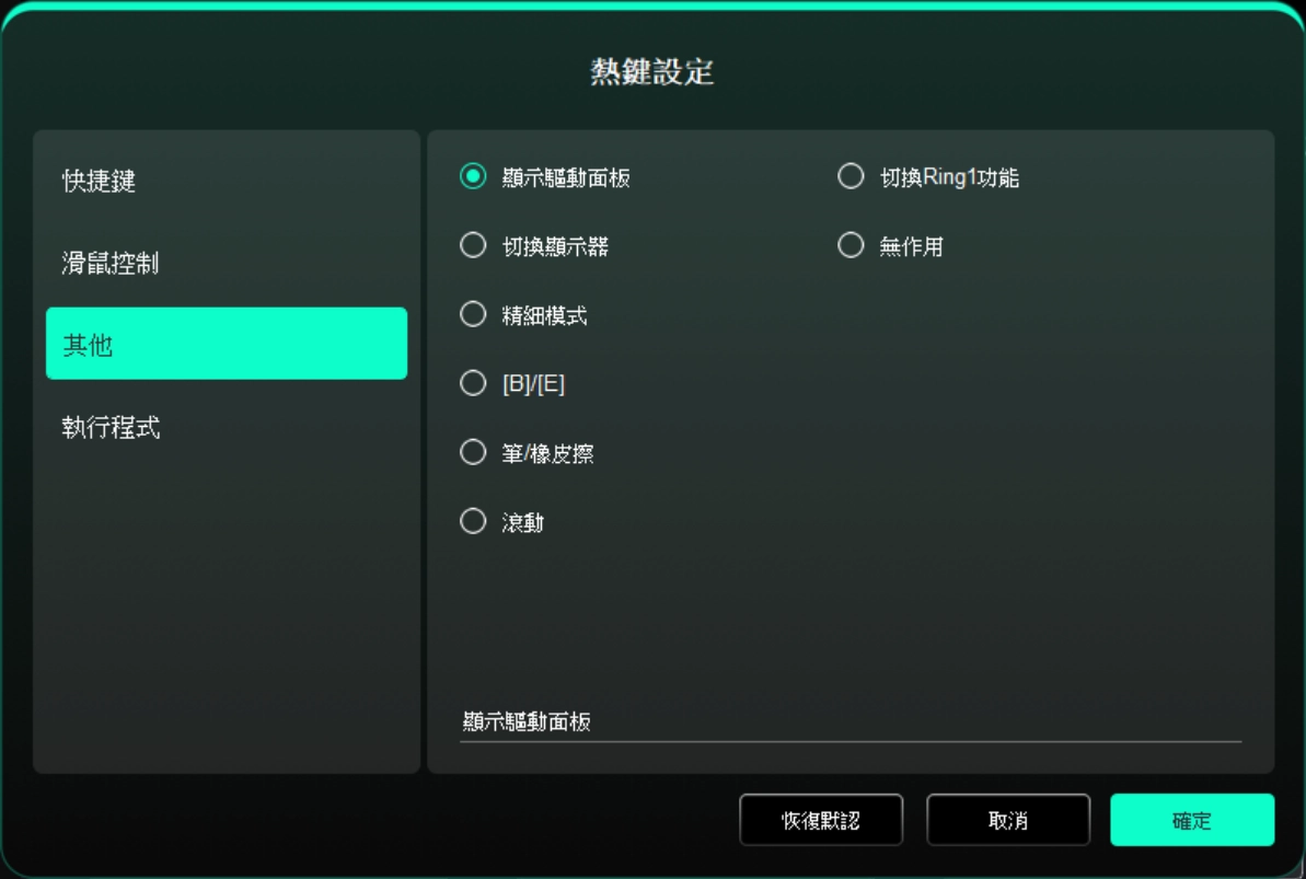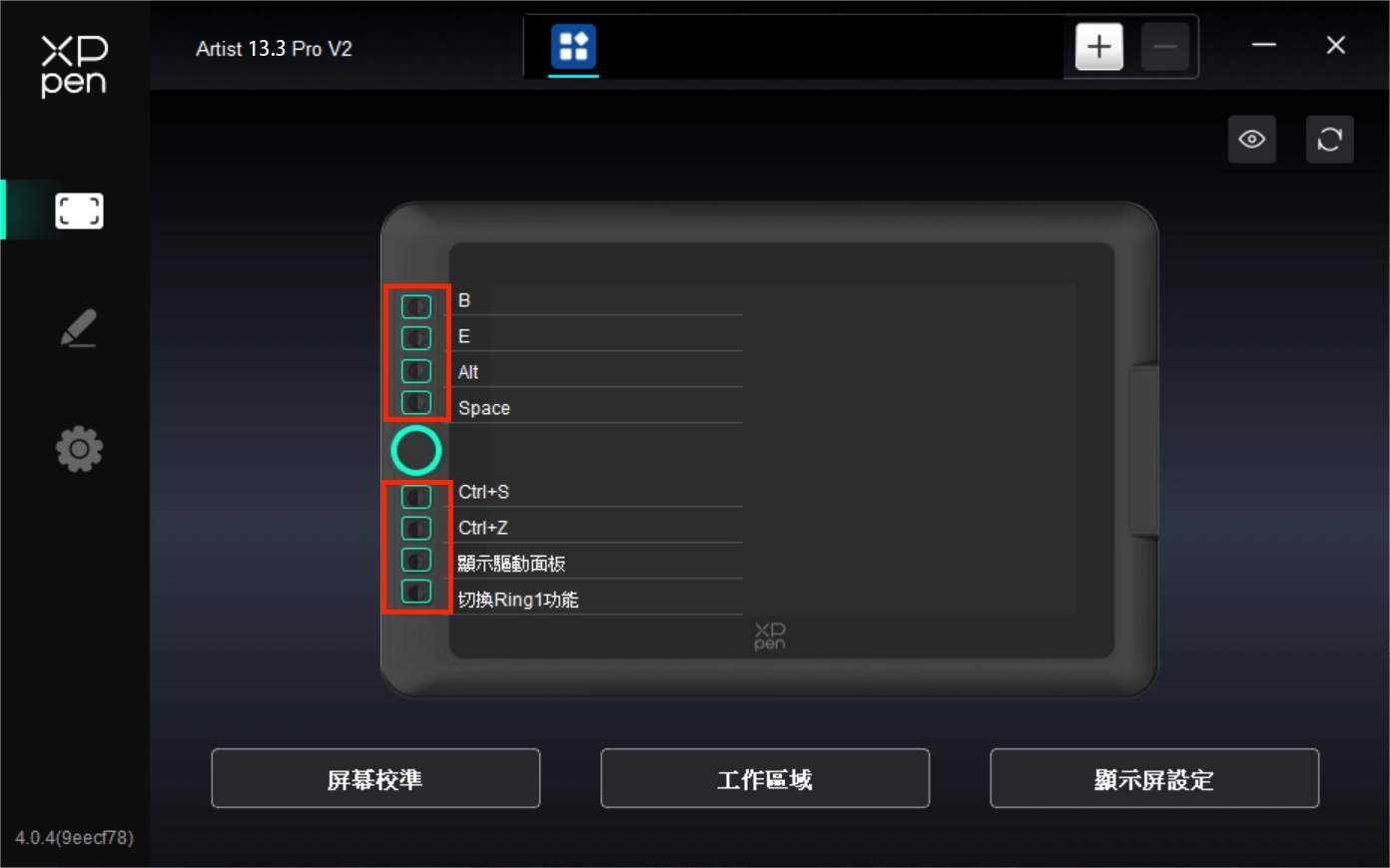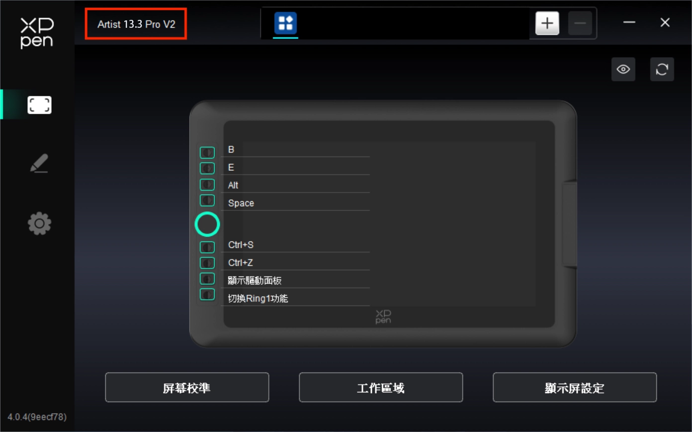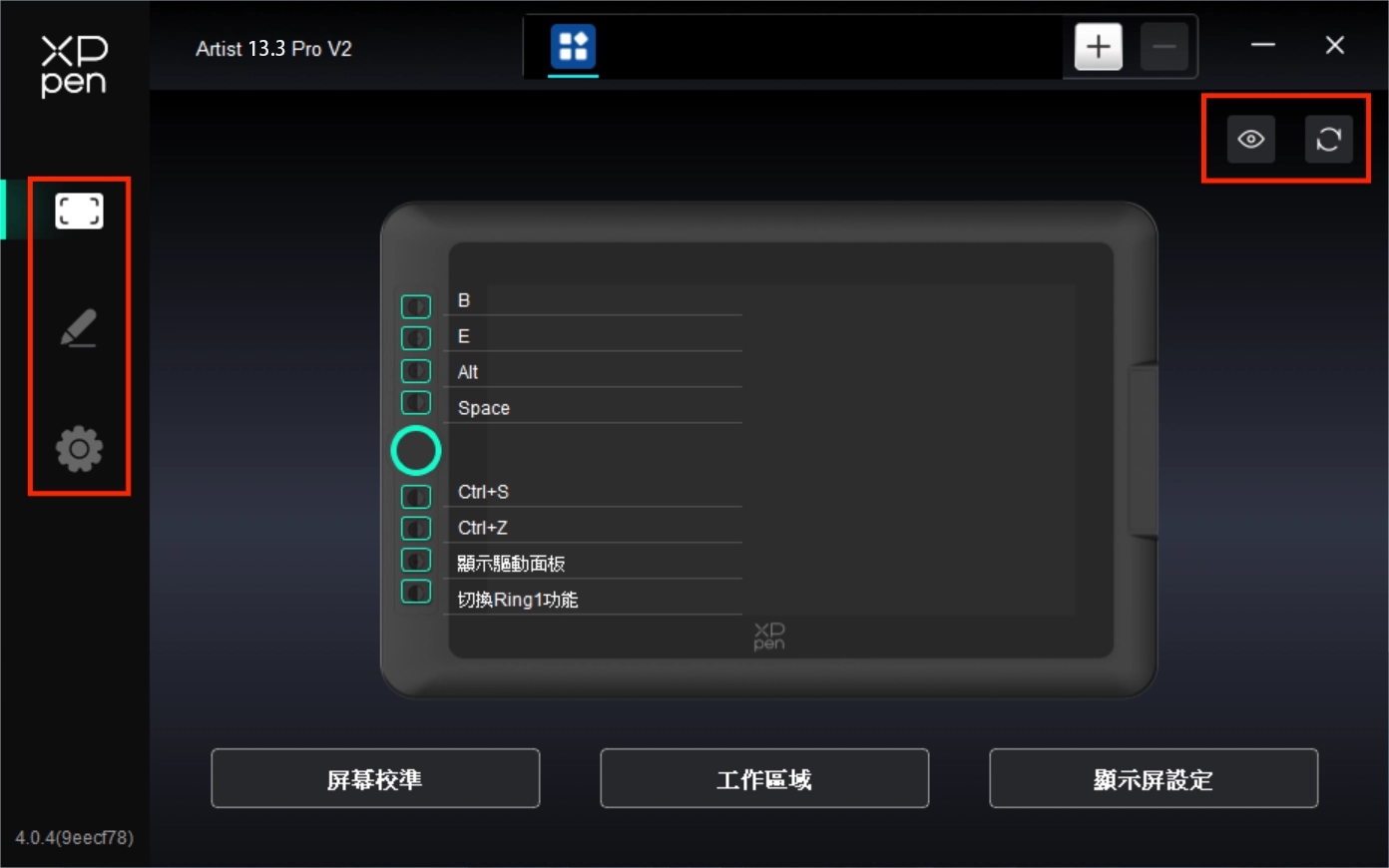 點擊左側欄圖標可切換驅動功能,從上到下依次為設備設置,筆設置,驅動設置