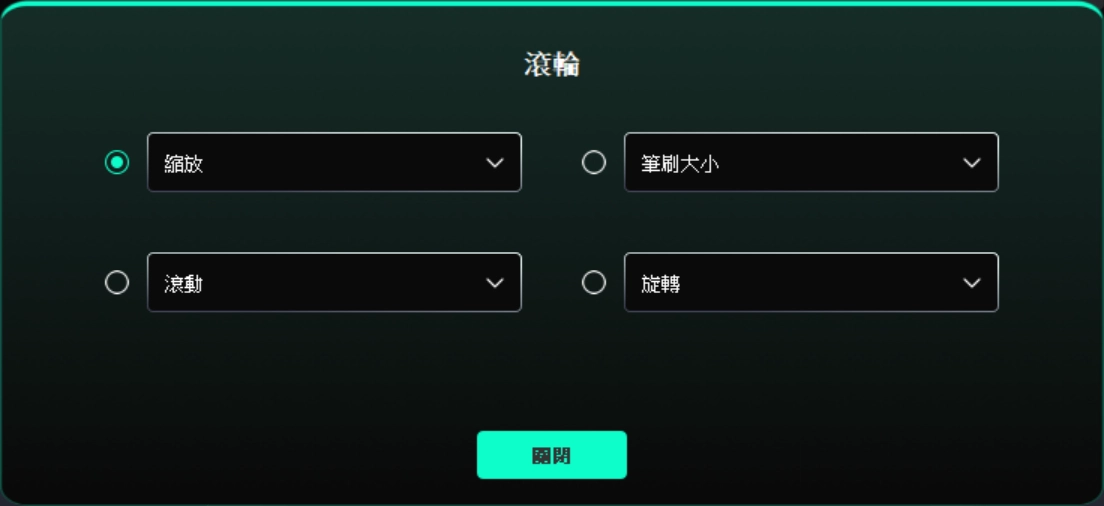 驅動提供縮放(默認)、滾動、筆刷大小、旋轉四組滾輪功能。
