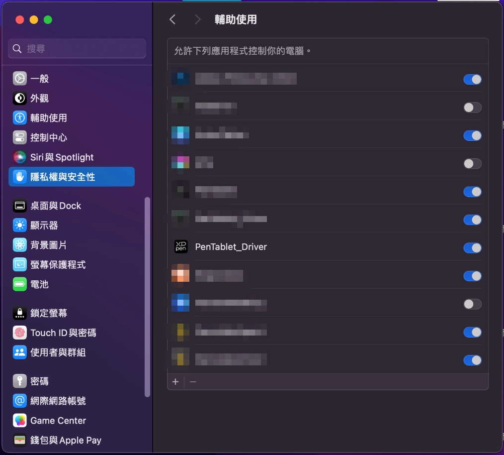 解壓後運行“pkg”文件,根據提示完成安裝,然後添加所需的安全設置(有線:系統設置->隱私與安全性->輔助功能),點擊添加圖標,授權解鎖後,請確保PenTablet_Driver選項已被勾選;否則,設備和驅動可能無法正常工作。