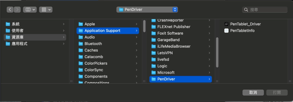 如列表中無PenTablet_Driver,請前往資源庫->Application Support->PenDriver 手動添加。