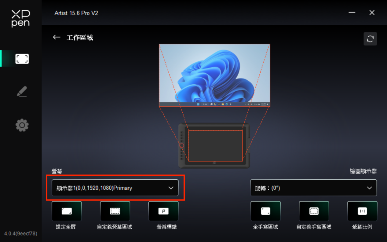 b) 如果您正在使用多個顯示器,且顯示器設置為擴展模式,請在屏幕選項卡選擇設備工作區域映射到哪個顯示器上。