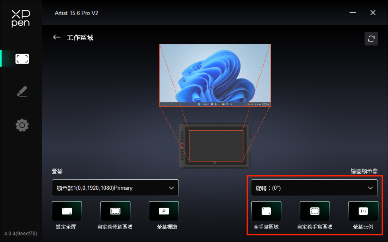 c) 熒幕比例:使設備工作區域與已選定顯示器的全部顯示區域比例相同。