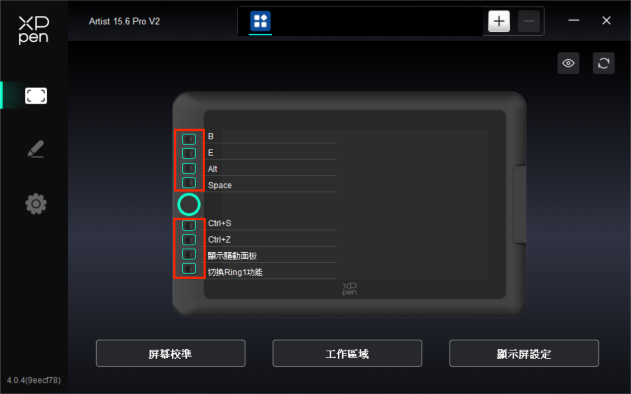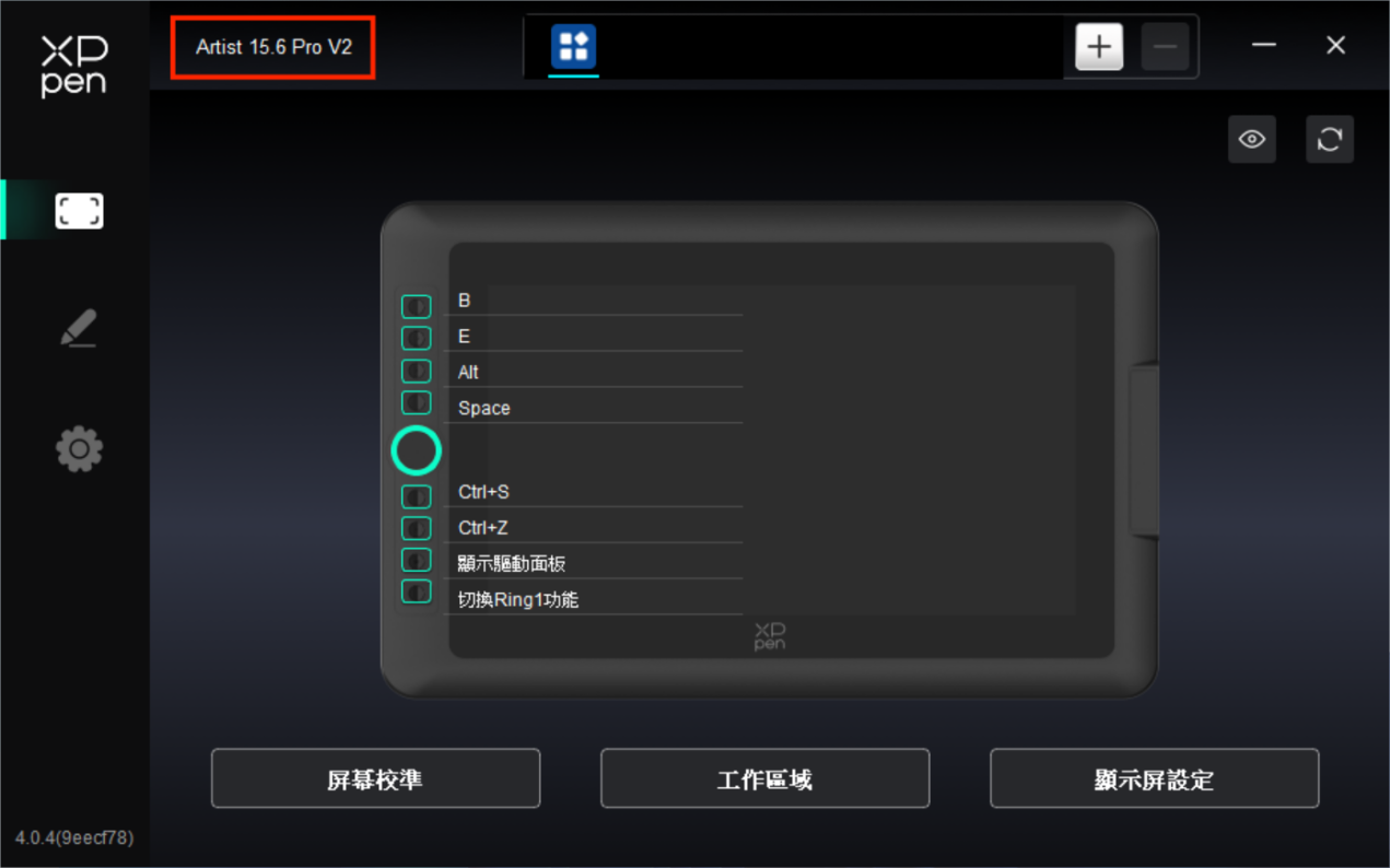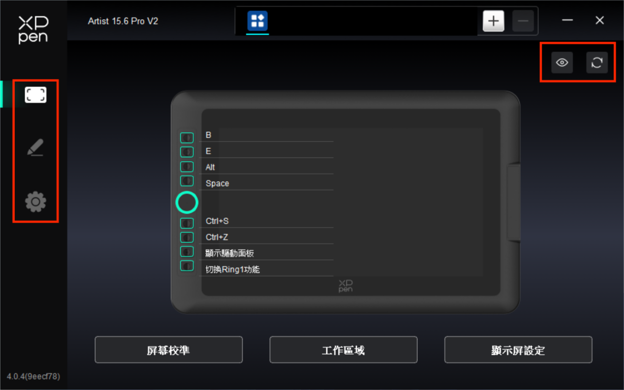 1. 點擊左側欄圖標可切換驅動功能,從上到下依次為設備設置,筆設置,驅動設置
