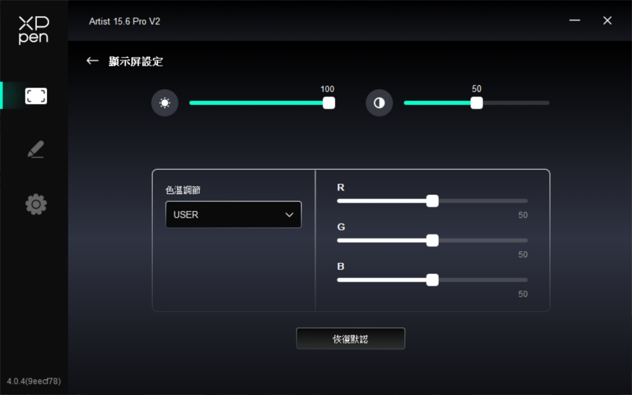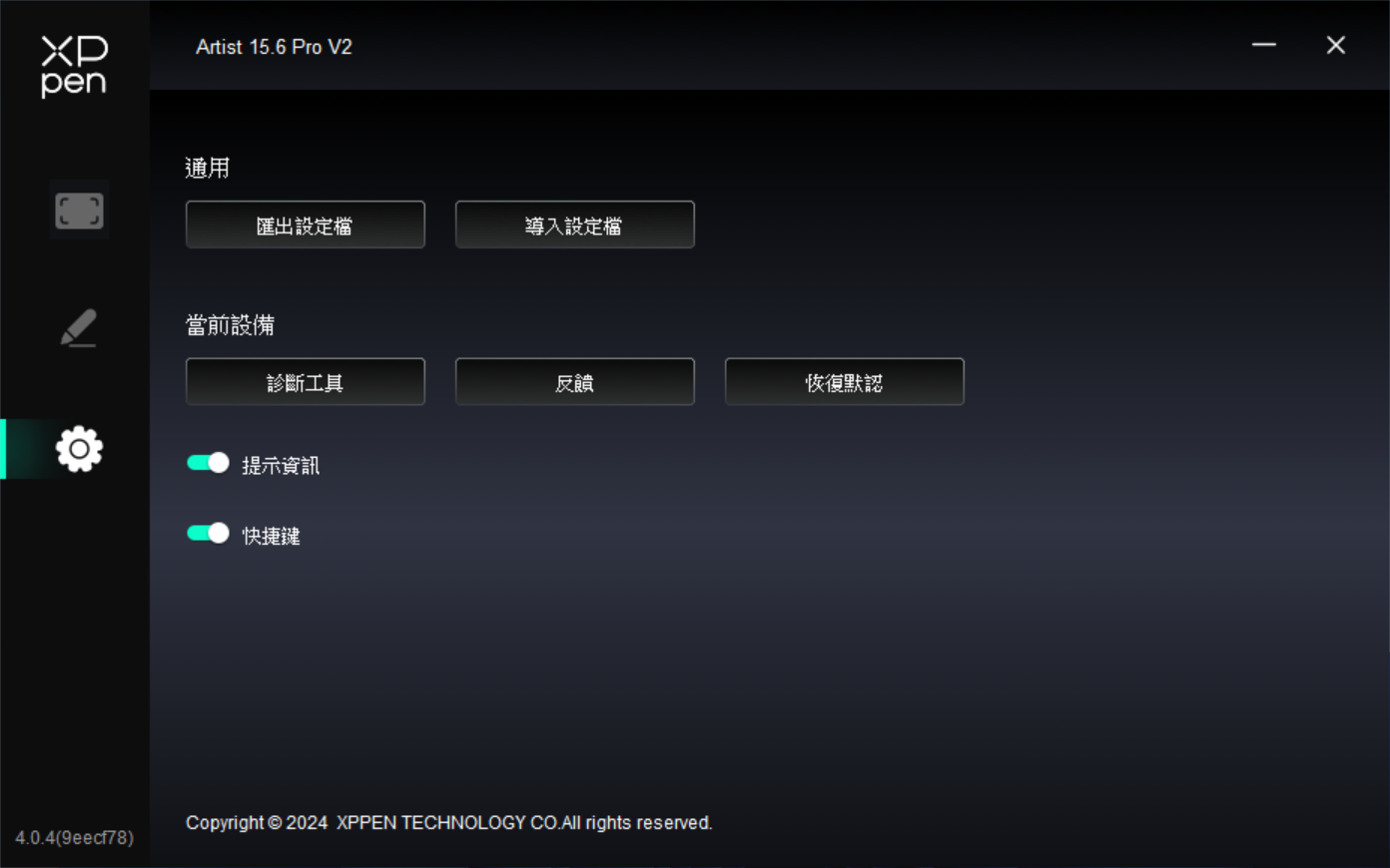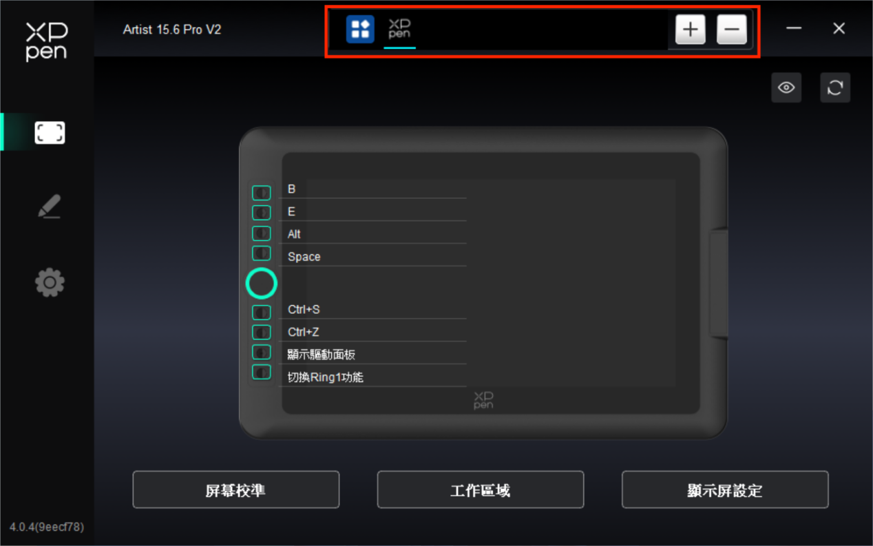 1. 點擊左側欄圖標可切換驅動功能,從上到下依次為設備設置,筆設置,驅動設置
