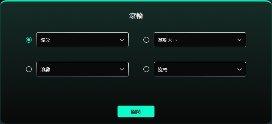 驅動提供縮放(默認)、滾動、筆刷大小、旋轉四組滾輪功能。