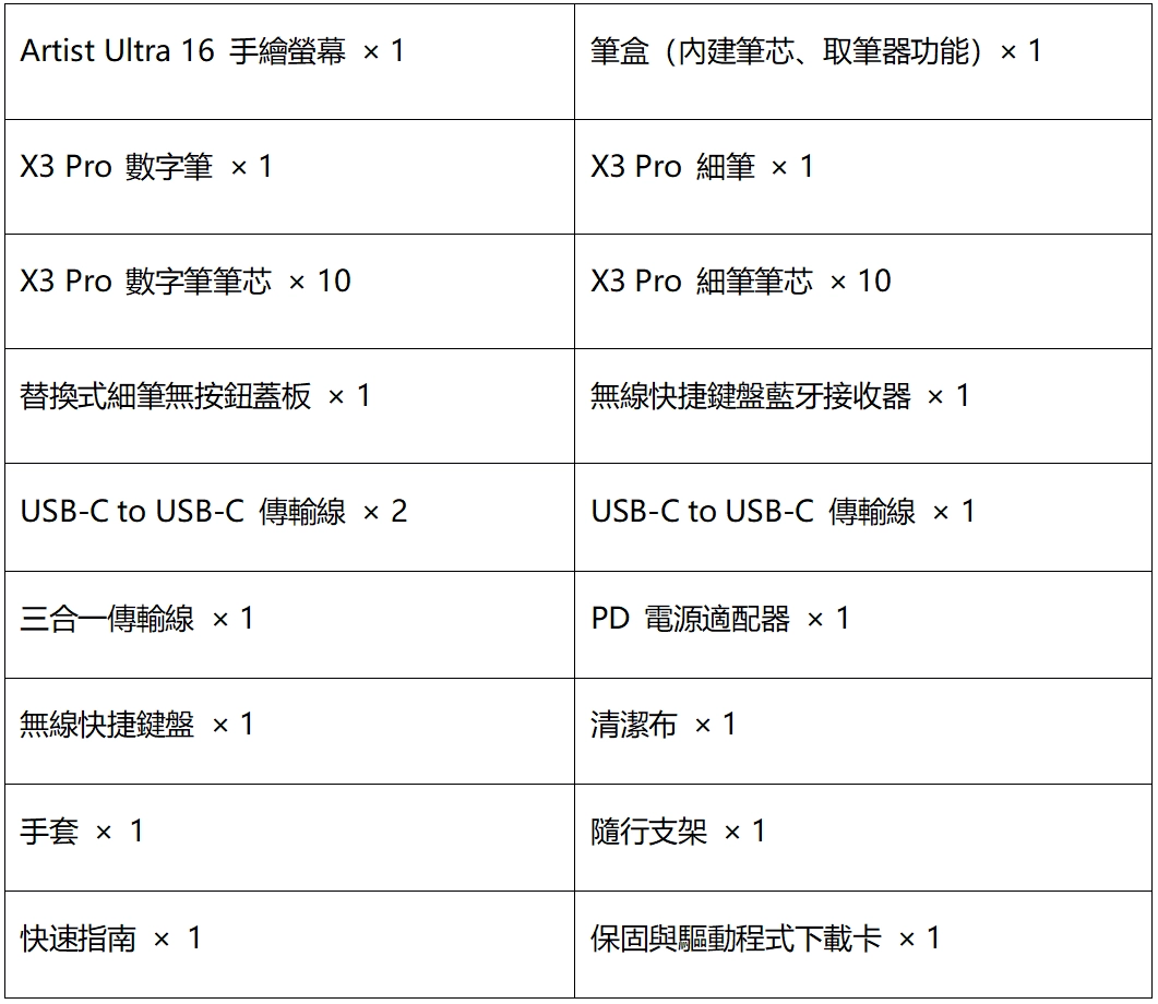 Artist Ultra 16 標準配備 X3 Pro 數字筆及 X3 Pro 細筆。X3 Pro 數字筆附帶矽膠筆套,可減少長時間創作疲勞。X3 Pro 細筆握持更方便,可拆卸按鍵功能可有效減少誤按操作。