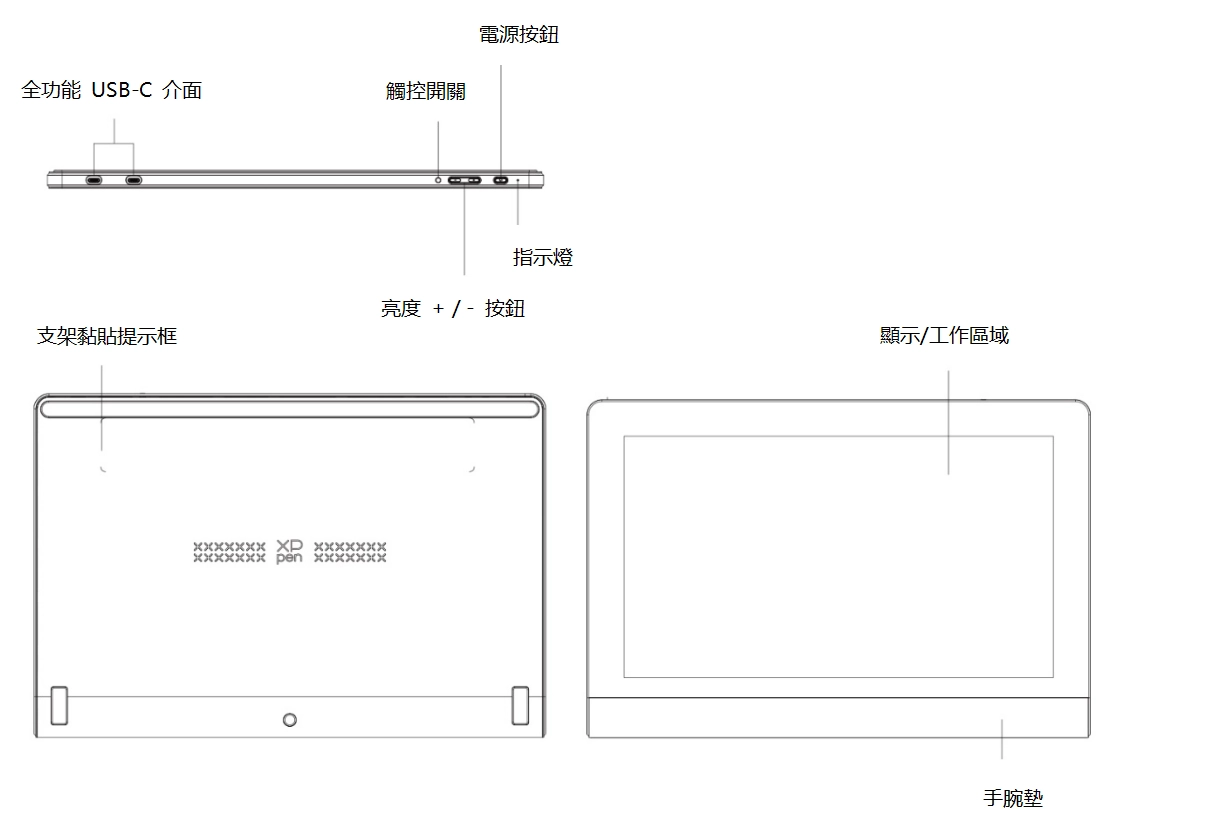 請注意,基於電腦輸出功率限制,使用 USB-C to USB-C 單一連接時,產品無法達到最大亮度,也可能出現螢幕閃爍或螢幕轉黑。若遇此狀況,請拿另外一條 USB-C 傳輸線連接至手繪螢幕和電源適配器取電。