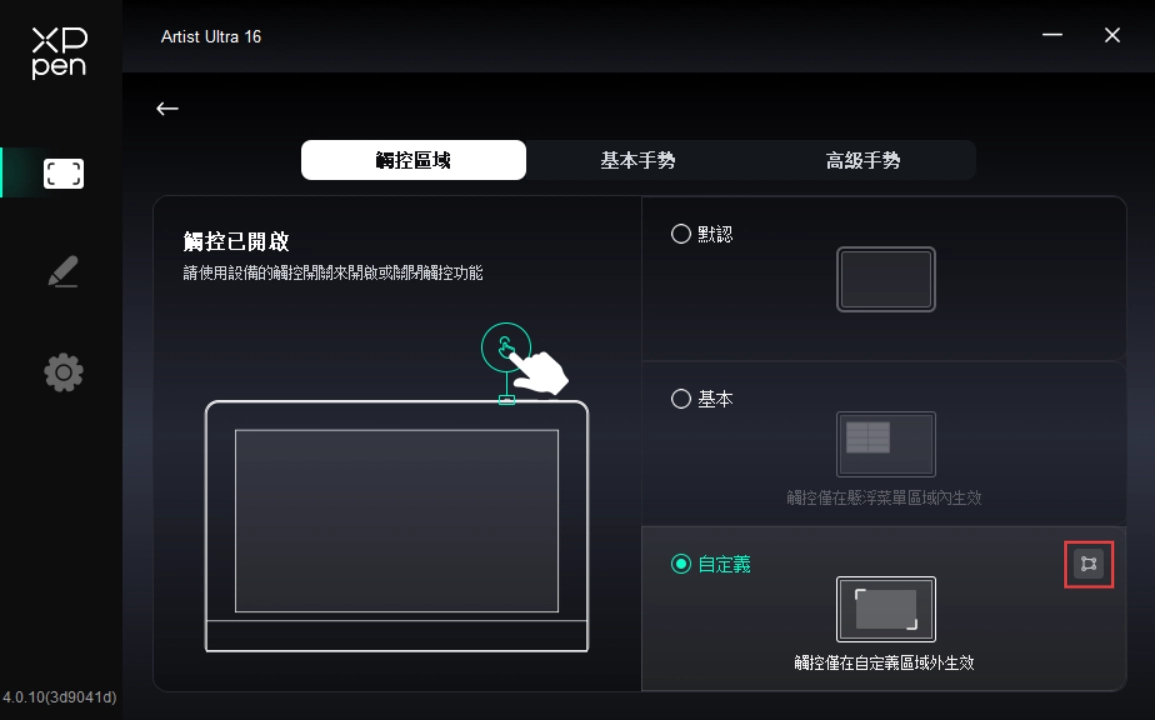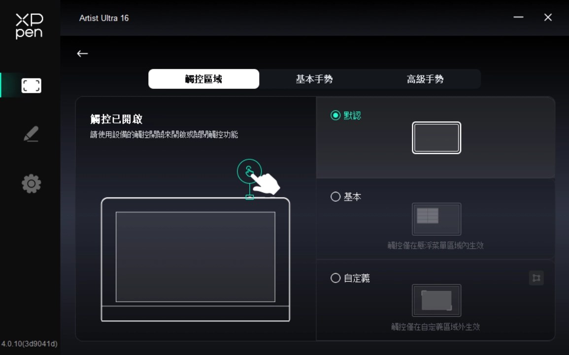 產品支援切換 3 種觸控區域,包括預設、基本及自訂。