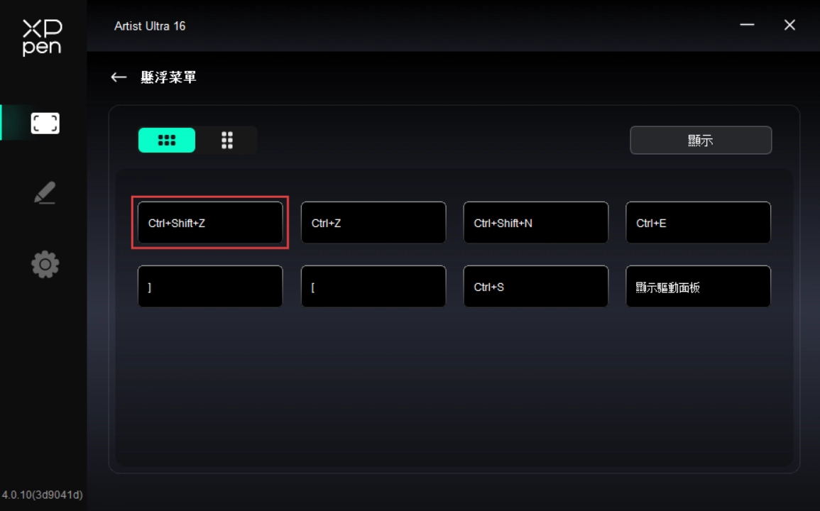 懸浮選單可在手繪螢幕或電腦顯示器上顯示懸浮快捷鍵。您可於懸浮選單設定常用操作,然後使用手繪筆、滑鼠或觸控點選該按鈕,執行所設定的操作。您可點選驅動程式首頁的「懸浮選單」按鈕進入懸浮選單頁面,自訂顯示方式及功能。