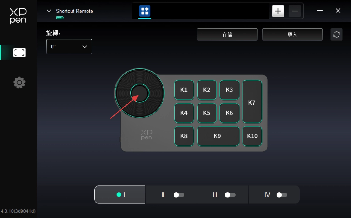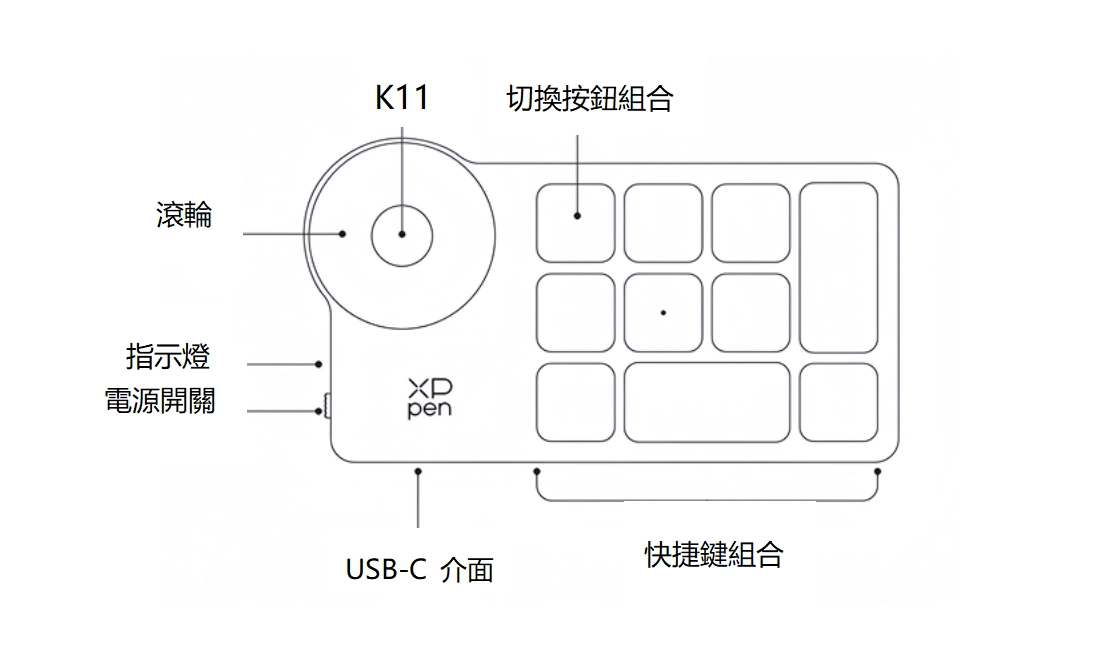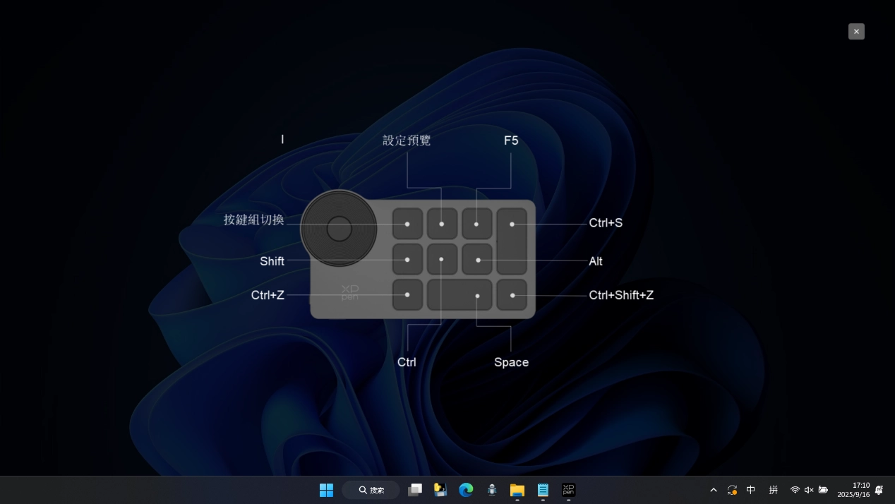 滾輪中間的按鍵可切換多個滾輪功能組合,驅動程式提供縮放(預設)、滾動、筆刷、旋轉等四個滾輪功能組合。