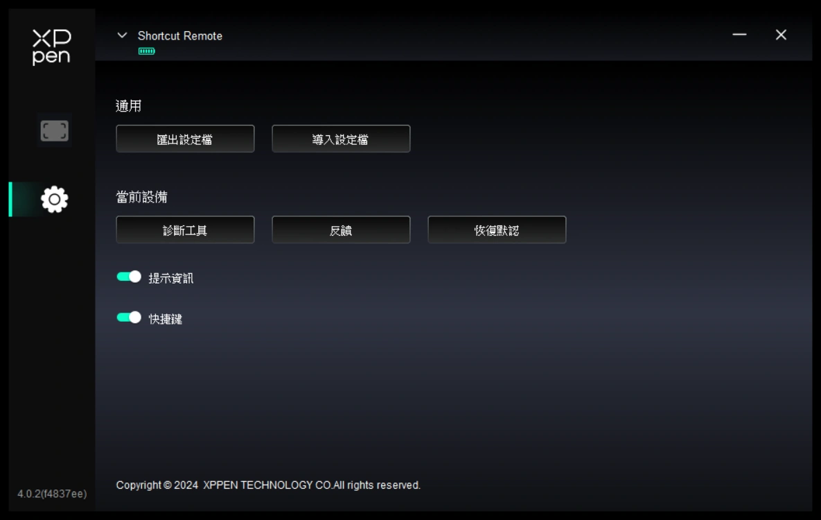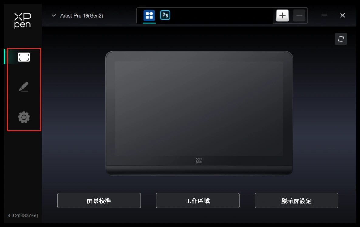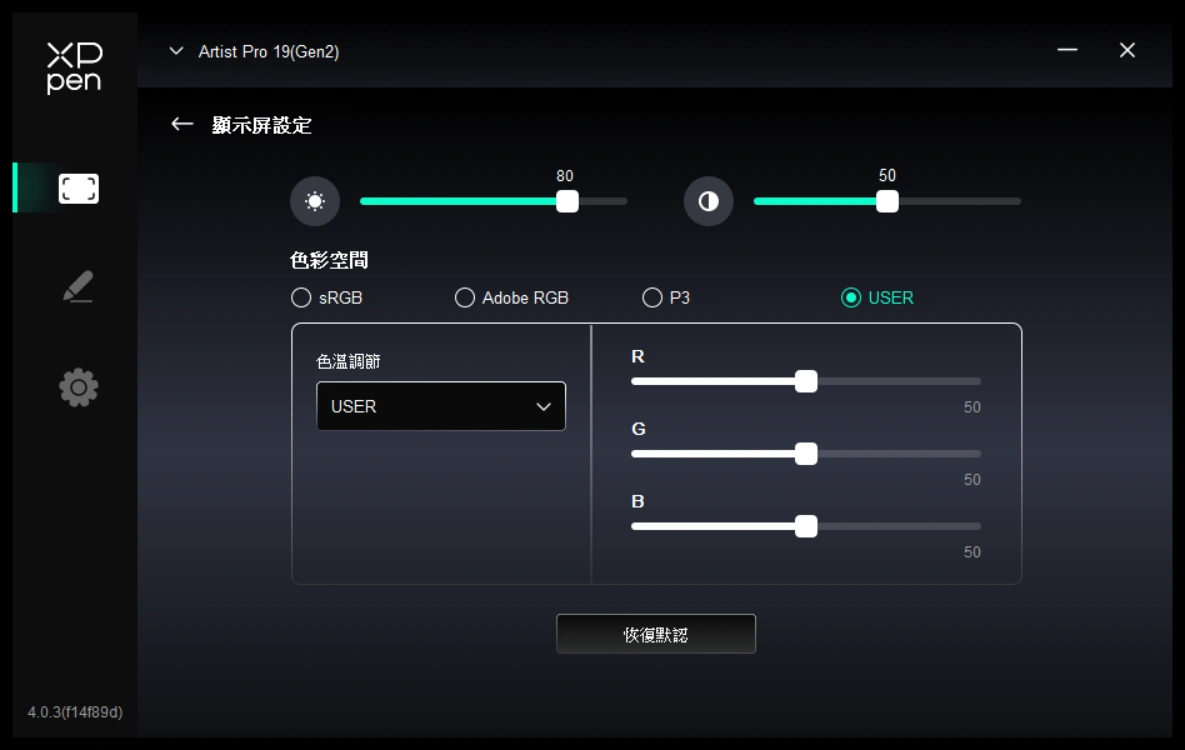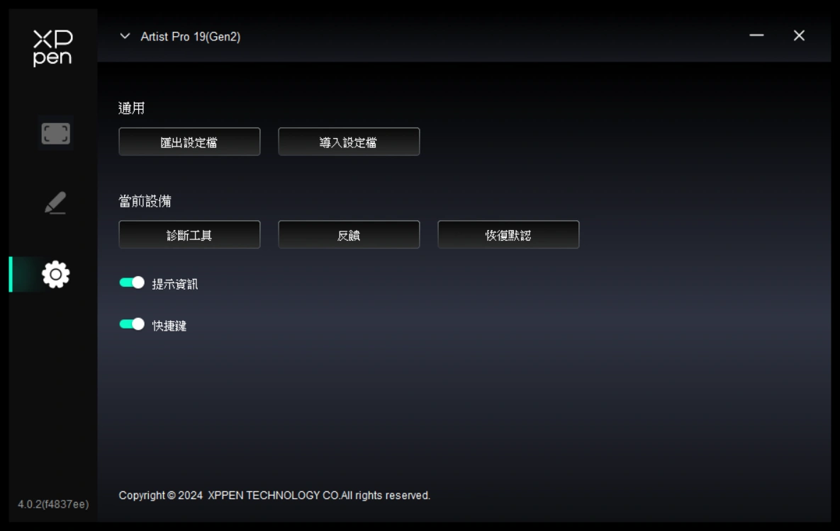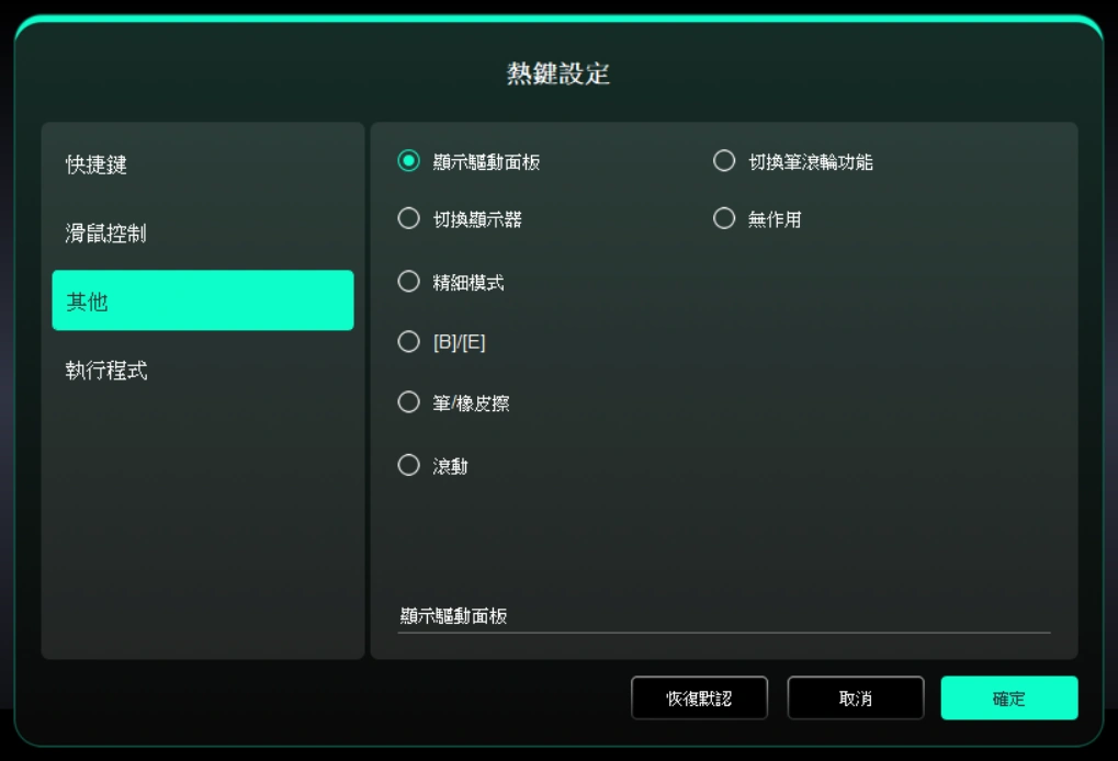 通過點擊左側圖示,可以切換驅動功能,從上到下依次為設備設置,筆設置,驅動設置,點擊右上角恢復默認按鈕,會恢復設備默認設置