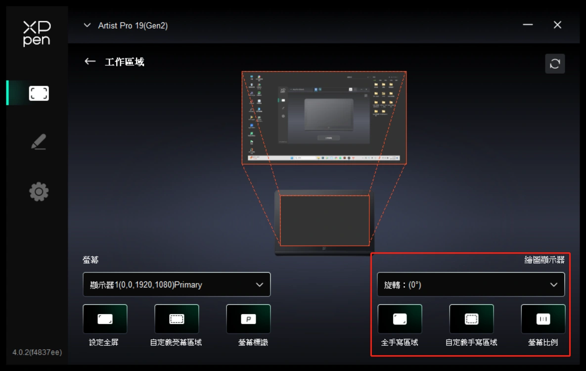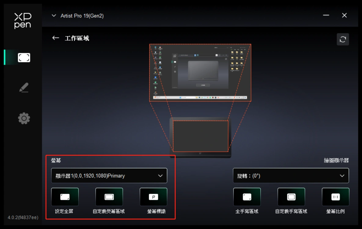 如果您正在使用多個顯示器,且顯示器設置為擴展模式,請在螢幕選項卡選擇設備工作區域映射到哪個顯示器上。