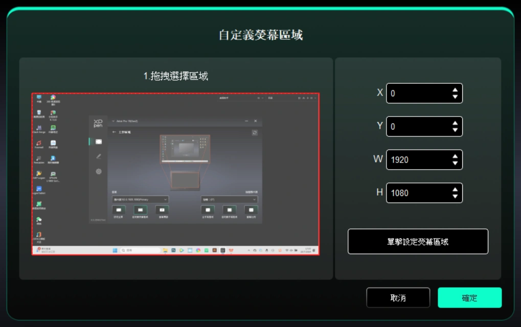 單擊設置螢幕區域:單擊後,在顯示器上點擊要選取的“左上角”位置和“右下角”位置。