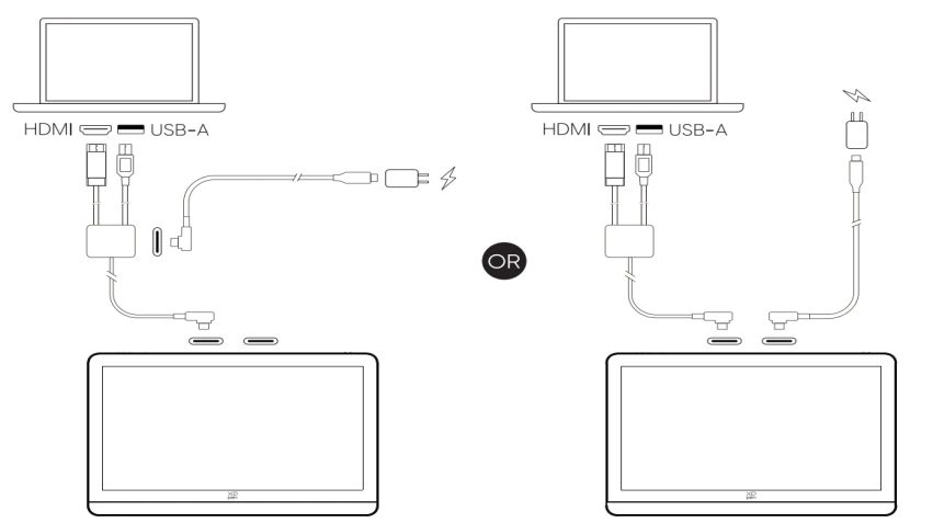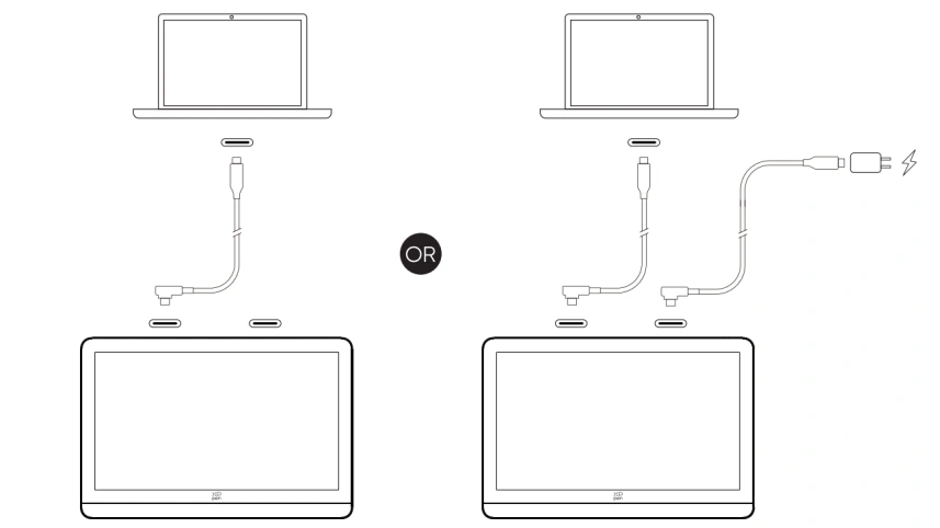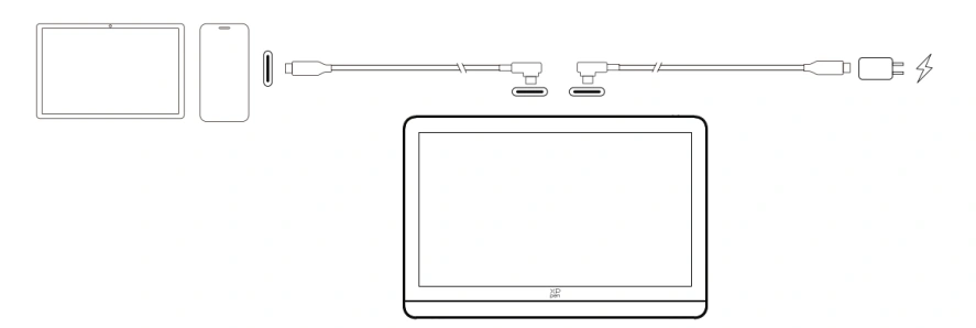 將一條USB-C to USB-C連接線連接您的安卓設備和數位屏,另一條USB-C to USB-C連接線連接數位屏和PD電源適配器並接通電源。
