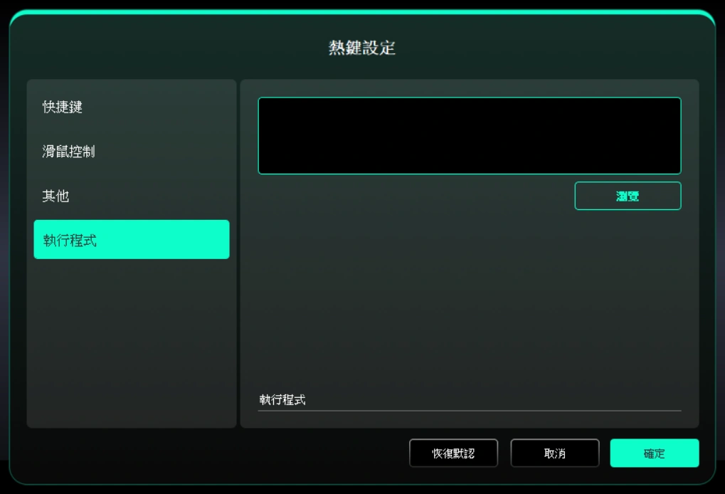 例如,如果選擇一個應用程式並更改配置,所做更改只會在使用該應用程式時有效。當切換不同的應用時,驅動將會自動識別。最多可添加7個應用程式。