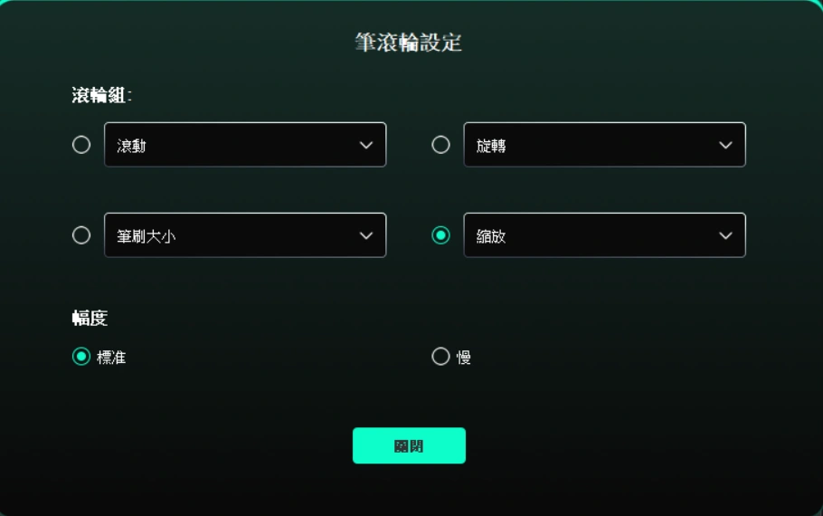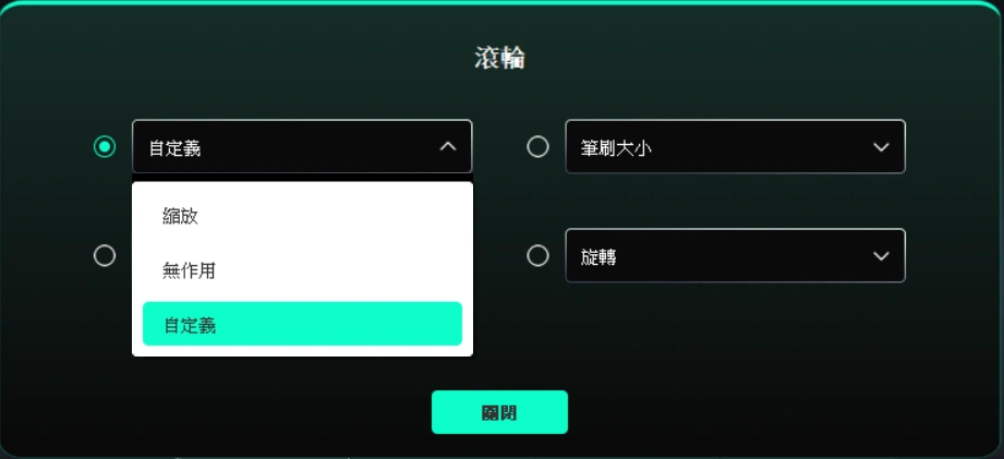 通過滾輪中間的按鍵可在滾輪各功能組間切換,驅動提供縮放(默認)、滾動、筆刷、旋轉四組滾輪功能。