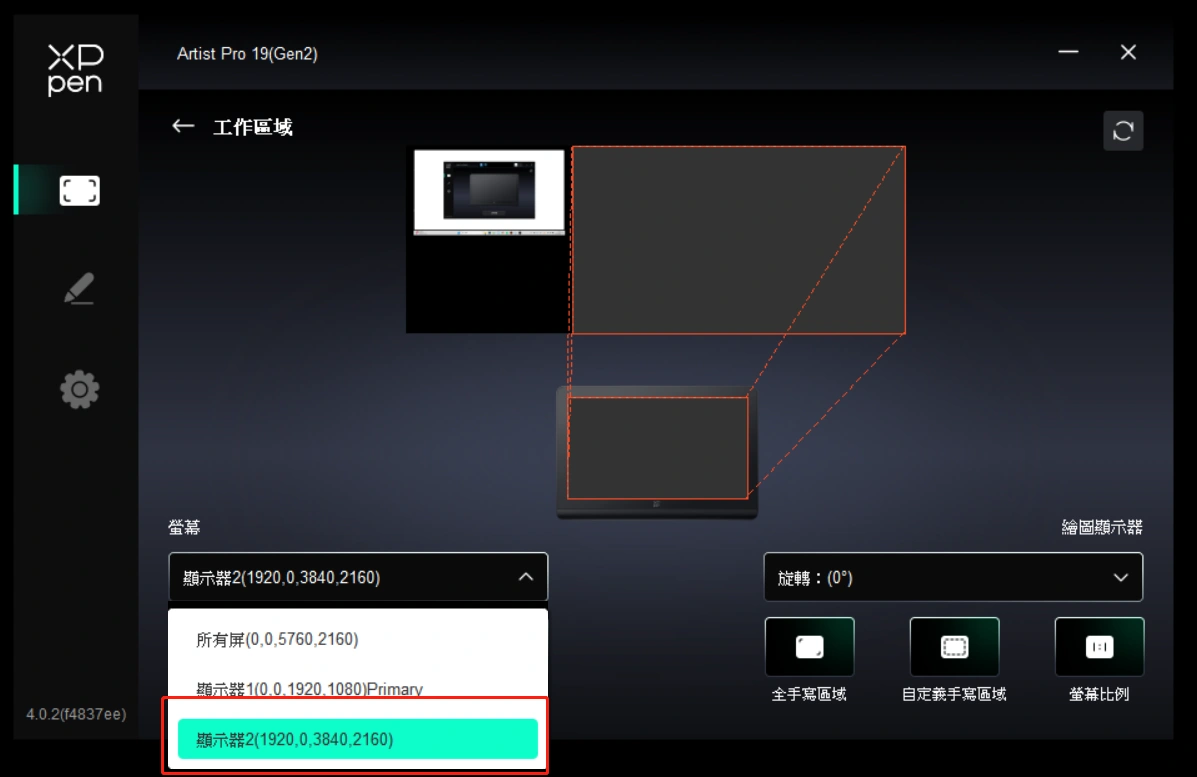 2) 如您使用螢幕擴展模式出現游標嚴重偏移,請進入驅動程式---繪圖顯示器---工作區域---螢幕,確認默認螢幕是否選中為繪圖顯示器(顯示器2)。