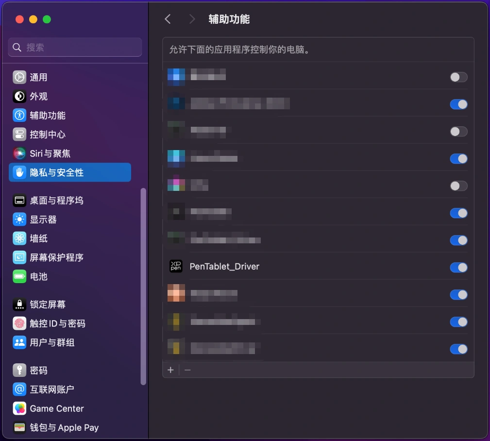 解壓後運行“dmg”檔,根據提示完成安裝,然後添加所需的安全設置(有線:系統設置->隱私與安全性->輔助功能),點擊添加圖示,授權解鎖後,請確保PenTablet_Driver選項已被勾選;否則,設備和驅動可能無法正常工作。