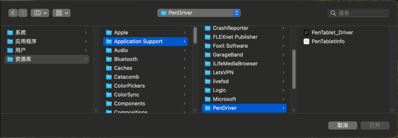 如列表中無PenTablet_Driver,請前往資源庫->Application Support->PenDriver 手動添加。